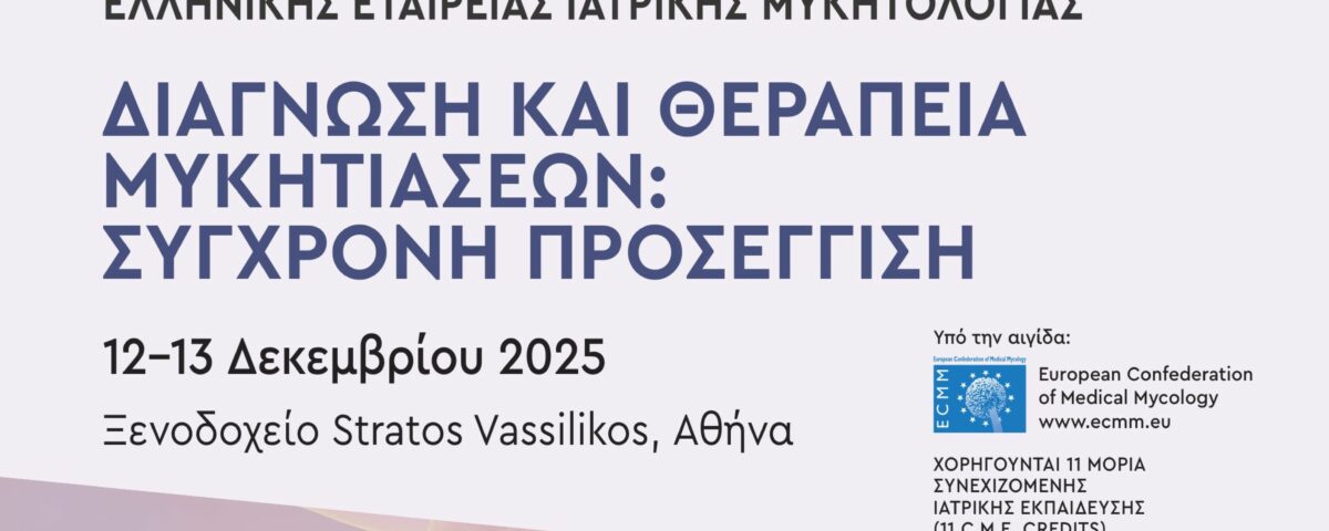 16 Ιουλίου, 20241Ημερίδα Ελληνικής Εταιρείας Ιατρικής Μυκητολογίας – Μυκητικές Λοιμώξεις: Νέα διαγνωστικά εργαλεία και νέες θεραπείες (19 Οκτωβρίου 2023, Αθήνα)